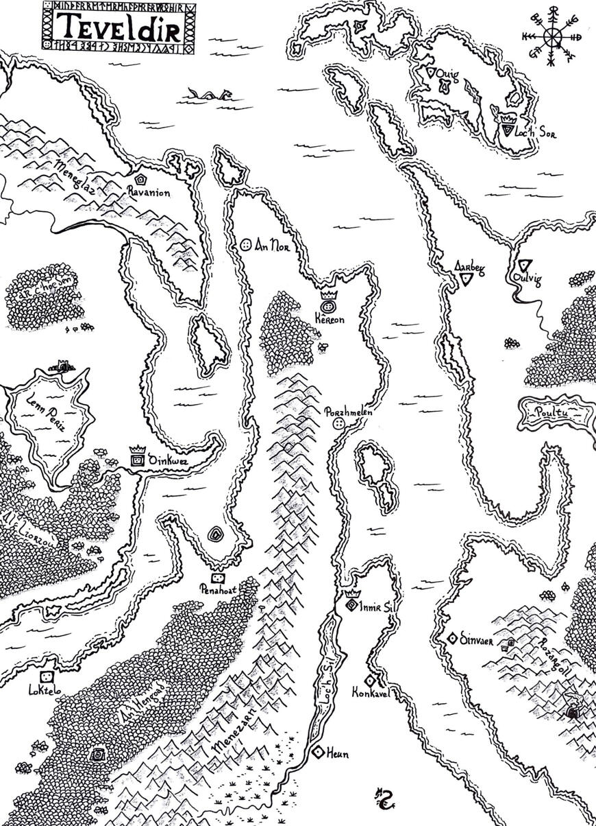 Kevrinoù a-leizh a gaver e Teveldir. Eno e kaver pemp bro bennañ : Tirada (kêrioù pennañ : Kêreon, An Nor, Porzhmelen), Rouantelezh an Inizi (kêrioù pennañ : Loc'h Sor, Aarbeg, Oulvig, Ouig), Rouantelezh Keulada (kêrioù pennañ : Innir Sil, Konkavel, Heun, Dinvaer), Kelevig (kêrioù pennañ : Dinkwez, Loktelo, Penahoat), ha Dukelezh Ravanion (ur gêr-stad tro-dro da Ravanion). Ouzhpenn d'ar broioù-se e kaver rouantelezhioù kuzh ar gorriked hag ar ramzed, dreist-holl er c'hoadoù ha dreist harzoù ar gartenn. Dañjerus e c'hell bezañ ar bed-se, rak leun ag igromañserien ha sorserien drouk eo. Da bellgargañ amañ.